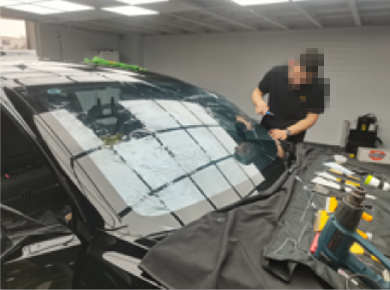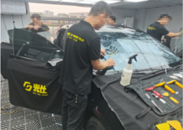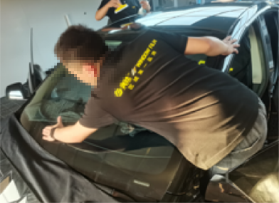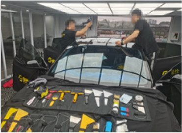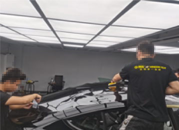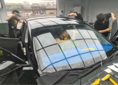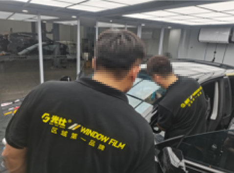 前窗膜裁剪与定型、后窗膜裁剪与定型,分别由二名技师主导完成;